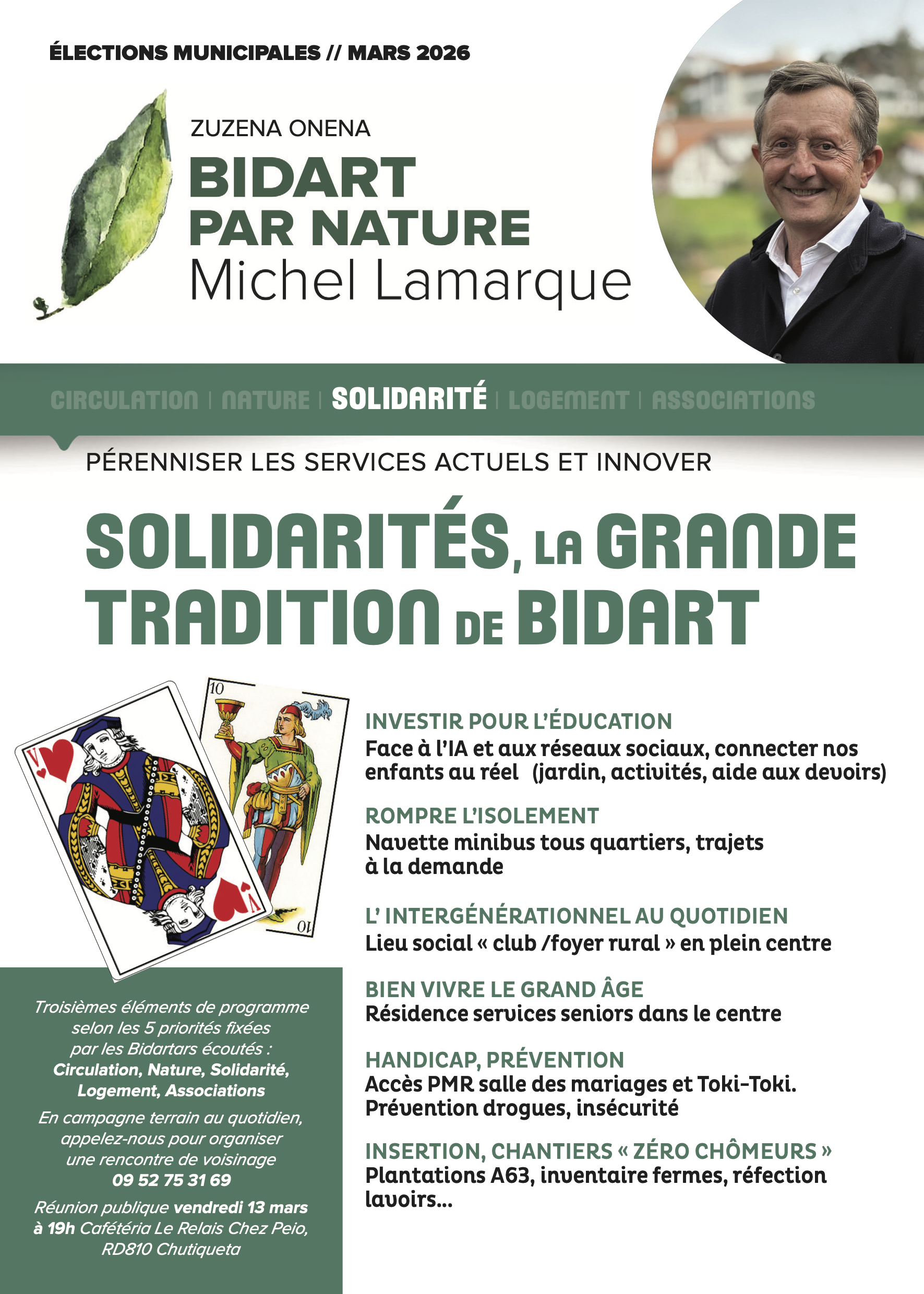 Depuis toujours, Bidart a pris grand soin de ses enfants et de ses aînés. Crèche et EHPAD municipaux, centre de loisirs, portage de repas, actions multiples du CCAS … ceci est à pérenniser, améliorer, peaufiner. Et en parallèle, dans un monde qui change, innover pour les nouveaux besoins.